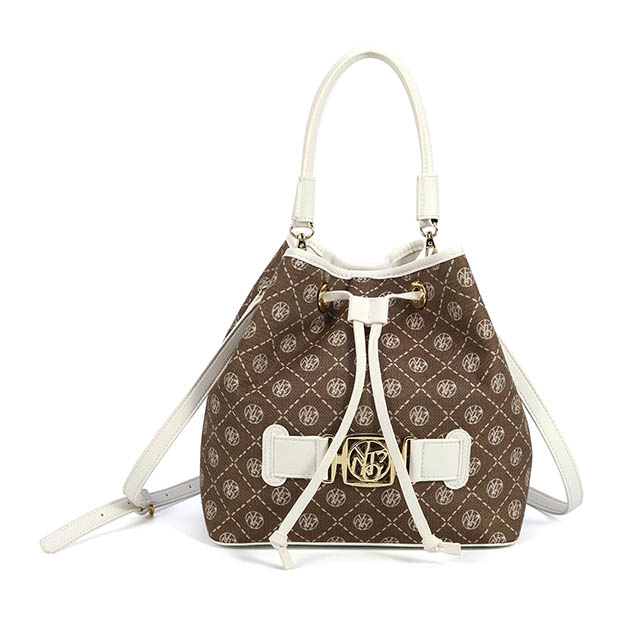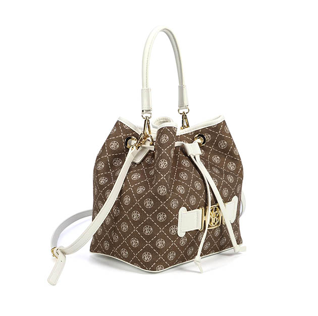 Secchiello donna marrone/bianco in tessuto, con inserti in pelle a contrasto di colore. Tracolle a spalla e lunga inย pelle removibili. Logo sotto forma di cintura sul davanti. Internamente composto da uno scomparto, una tasca con zip e due tasche normali.