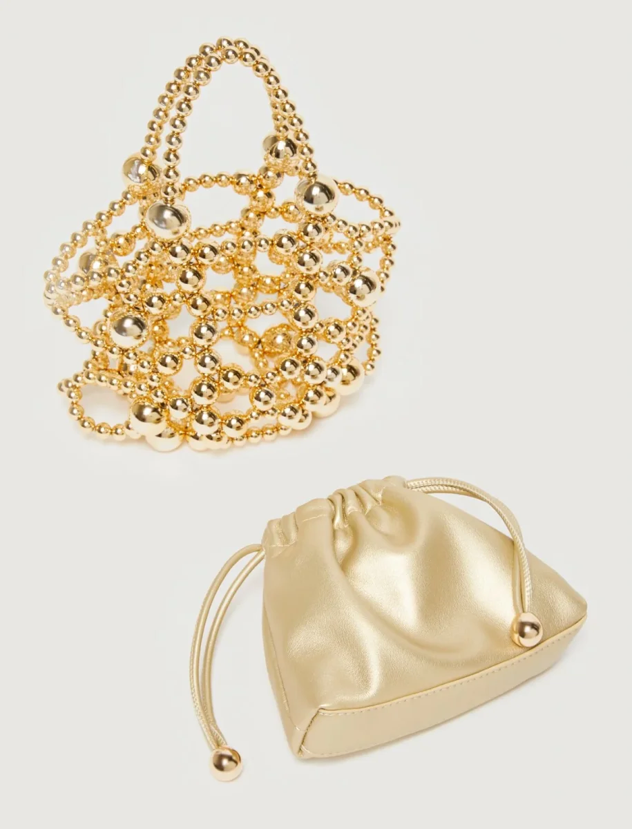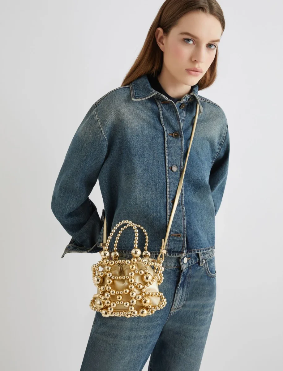 Compatto nei volumi, grande nello stile: il nuovo secchiello รจ in equilibrio tra accessorio e gioiello, con le sue boule dalla finitura perlata che creano una gabbia esterna. All’interno, una comoda pouch per contenere solo l’essenziale.