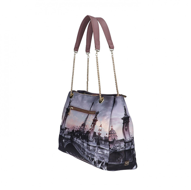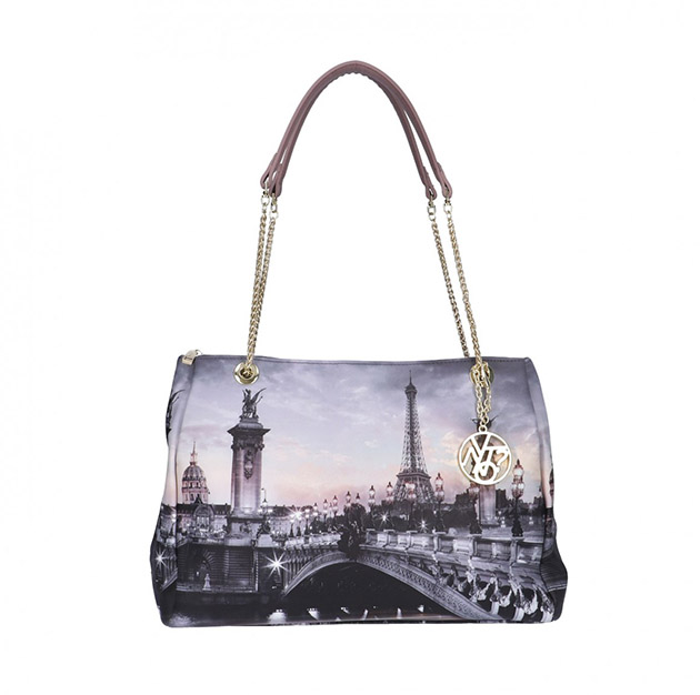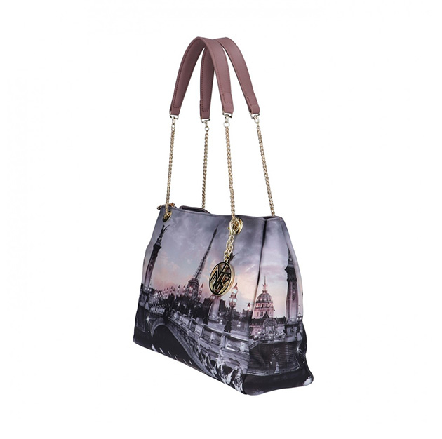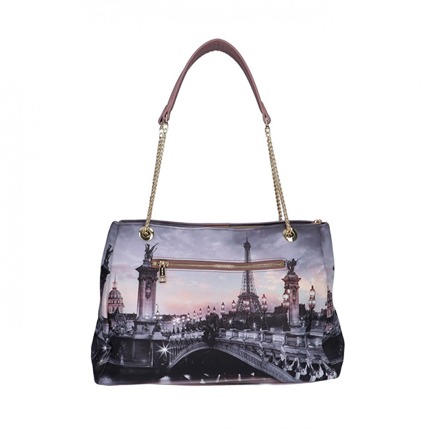 Borsa a spalla nude ecopelle, con stampa Parigi. Tasca sul retro con cerniera. Internamente in tessuto, รจ suddivisa in tre scomparti, due chiusi con clip e quello centrale con cerniera. Vi alloggiano tre taschini, dei quali uno con zip ed รจ accessoriata di portachiavi.