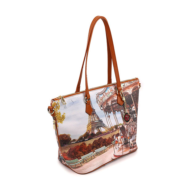 Borsa shopping Donna in goffrato, con stampa Parigi. L’interno รจ foderato in tessuto logato Ynot, 1 scomparto con tasche porta oggetti di cui 1 con zip, 1 tasca esterna con zip. Logo Ynot stampato sulla borsa. Portachiavi logato Ynot rimovibile. Tracolla regolabile e removibile. 1 COMPARTO ACCESSORI INTERNI 1 TASCA LATERALE CON ZIP 2 MANICI A SPALLA 1 TRACOLLA REGOLABILE E AMOVIBILE MATERIALE : ECOPELLE CHIUSURA PRINCIPALE CON ย ZIP