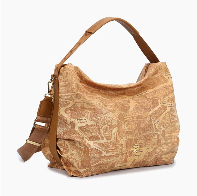Shopping Hobo a spalla tan in tessuto, con inserti in pelle.ย  Con il suo design morbido e fluido, questa borsa offre un ampio spazio interno, perfetto per contenere tutto ciรฒ di cui hai bisogno nella tua giornata. La sua forma unica e il manico curvato la rendono facilmente riconoscibile, aggiungendo un tocco di stile a qualsiasi look.ย  La presenza di una tracolla regolabile la rende ancora piรน comoda, permettendo di portarla facilmente a spalla o a tracolla. Una scelta perfetta per chi ama un accessorio che unisce comfort e tendenze moderne. Grafica Roma stilizzata. Unico scomparto chiuso con zip Interno…