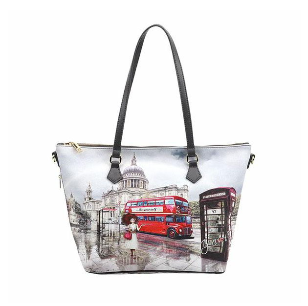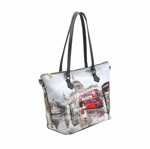 Shopping small Donna in groffato, con stampa Londra. Chiusura con cerniera lampo e piccola tasca laterale con zip. Interno foderato con tasche multifunzione e tasca zip. Tracolla removibile.