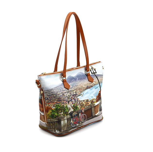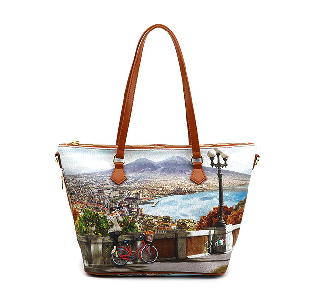 Shopping small Donna in groffato, con stampa Golfo di Napoli. Chiusura con cerniera lampo e piccola tasca laterale con zip. Interno foderato con tasche multifunzione e tasca zip. Tracolla removibile.