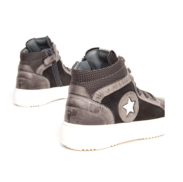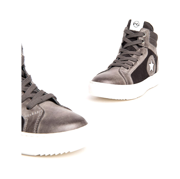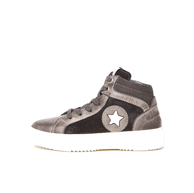 Sneaker alta Bambino grigia in pelle e camoscio, con inserti a contrasto di colore. Stile urban-sporty. Made in Italy.