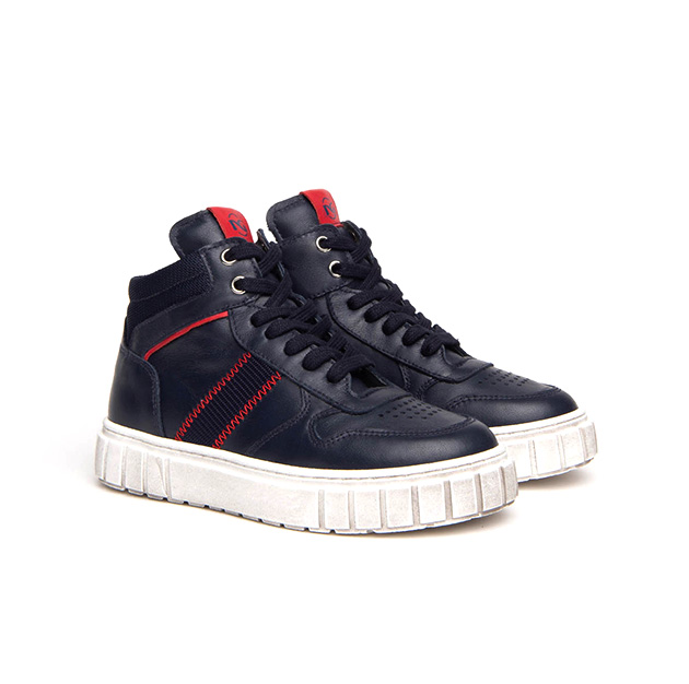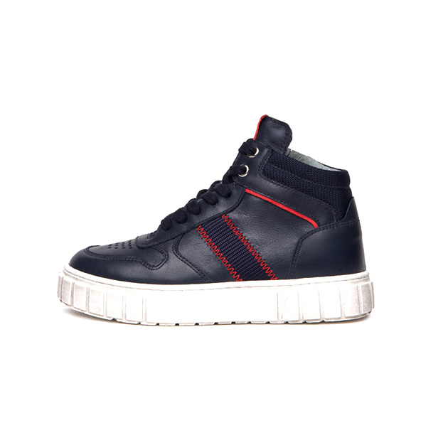 Sneaker alta Bambino blu in pelle e camoscio, con inserti a contrasto di colore e suola a cassetta effetto vecchio. Stile urban-sporty. Made in Italy.