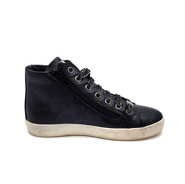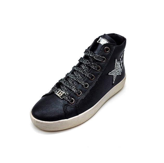 Sneaker alta Bimba nera in ecopelle, con chiusura laterale zip e lacci lurex. Logo laterale con stella in borchie.
