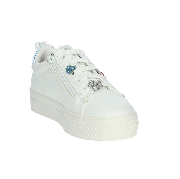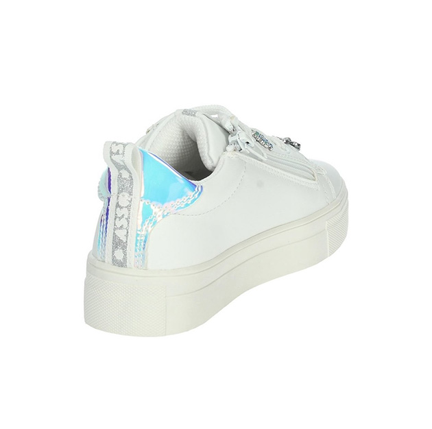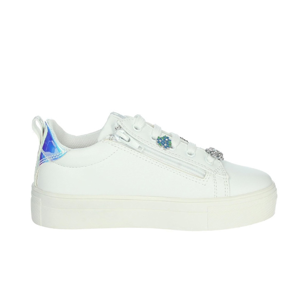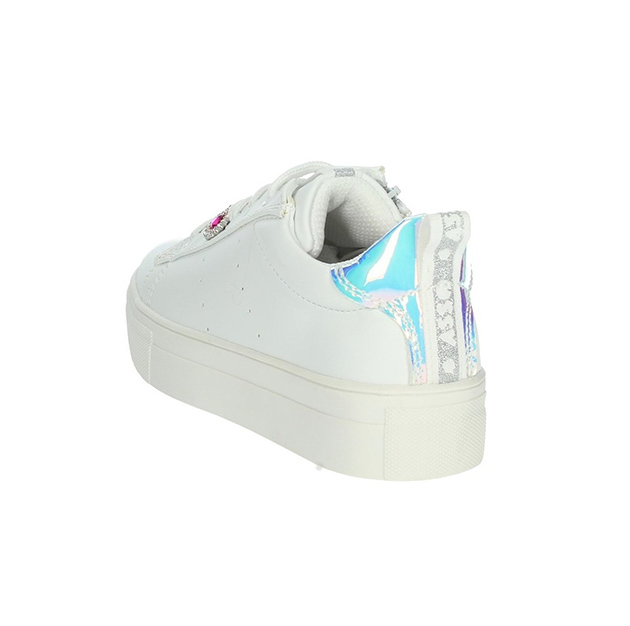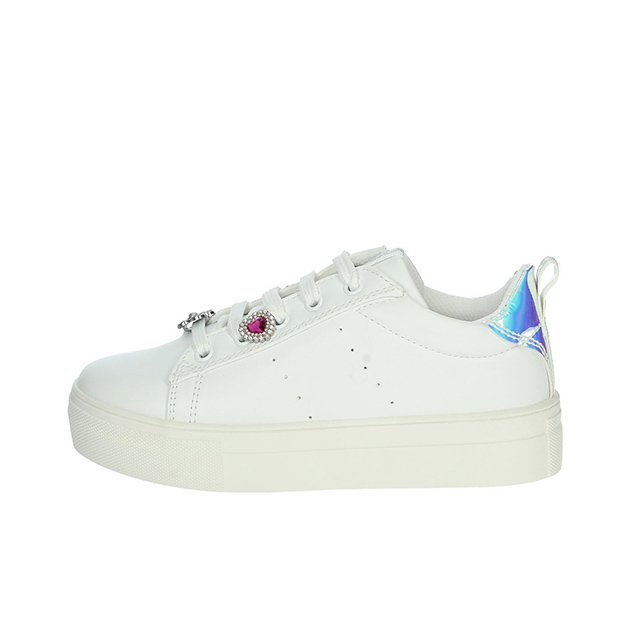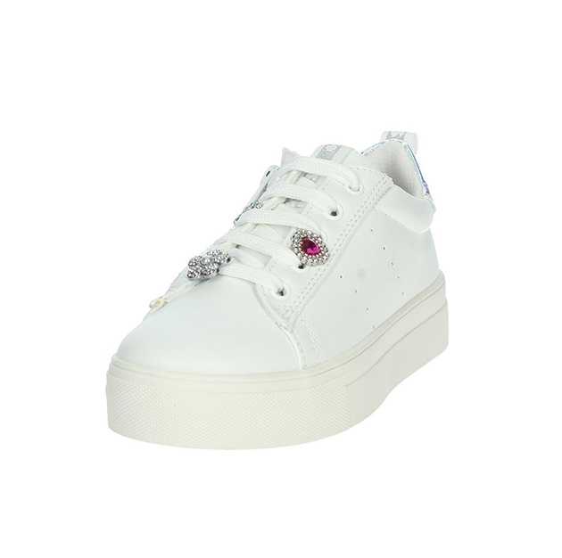 Sneaker Bambina bianca in ecopelle, con dettagli gioiello sulle stringhe e a contrasto di colore. Logo sul retro.ย In regalo gli occhiali fashion. Calzata dal 30 al 39.