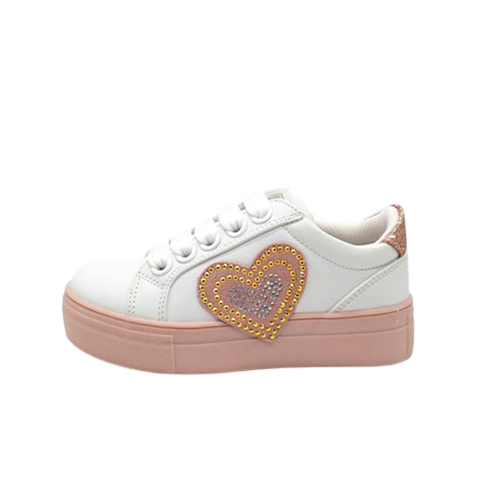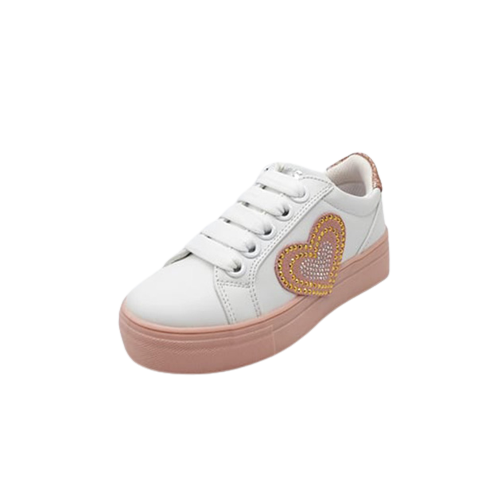 Sneaker Bambina bianca in ecopelle, con dettagli a contrasto di colore ed impreziosita da un cuore laterale rosa con applicazione di mini-borchie. In regalo gli occhiali fashion. Calzata dal 26 al 30
