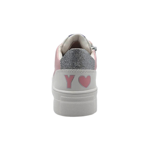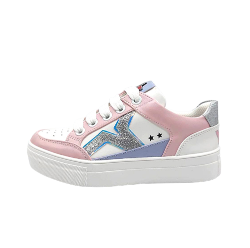 Sneaker Bambina bianca e rosa in ecopelle, con dettagli a contrasto di colore ed inserti glitter laterale l retro. Stile sporty-glam.