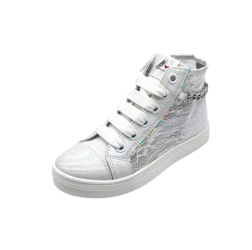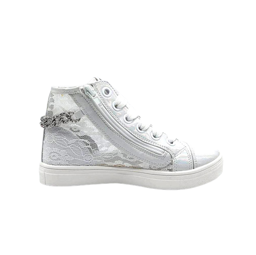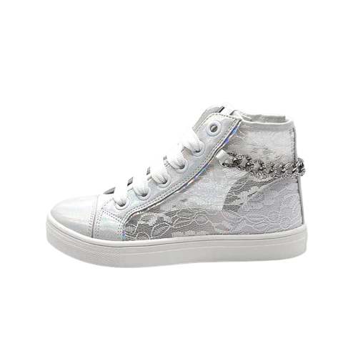Sneaker Bambina bianca in tessuto traforato ed ecopelle, impreziosita da catena con brillantini posteriore. Stile sporty-chic.