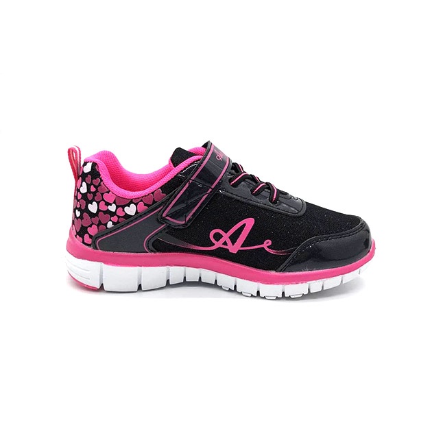 Sneaker Bambina nera in tessuto glitterato ed inserti in pelle lucida ed a contrasto di colore, con logo laterale e cuoricini sul retro. Stile sporty-glam.
