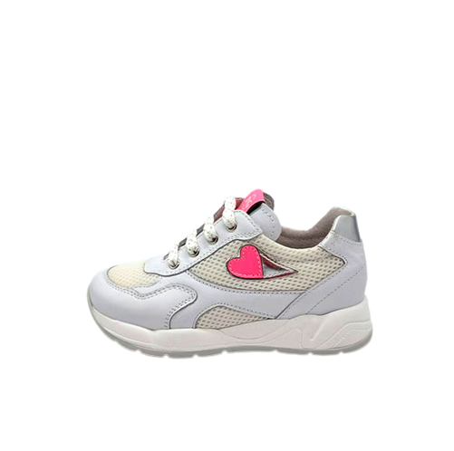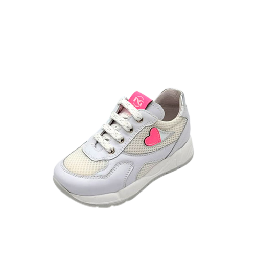 Sneaker Bambina bianca in pelle e tela, con applicazione fluo a forma di cuore ed inserti laminati. Stile sporty-glam. Made in Italy.