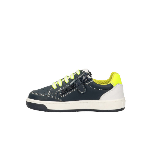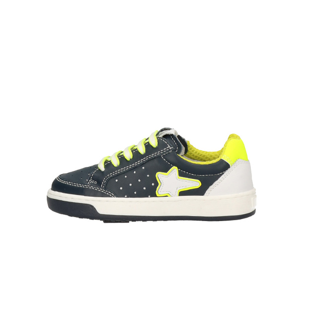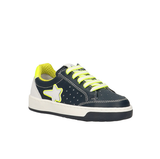 Sneaker Bambino blu in pelle a tratti traforata, applicazione a forma di stella ed inserti fluo a contrasto. Look sporty-urban. Made in Italy.
