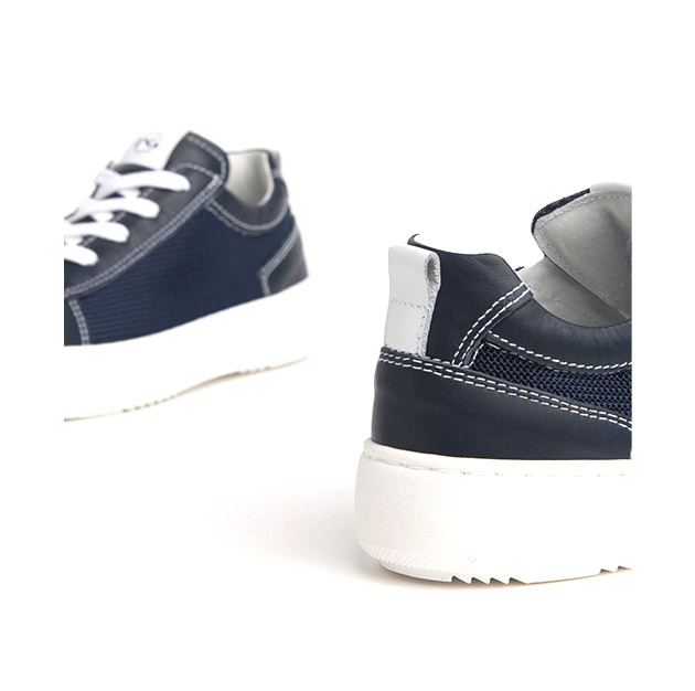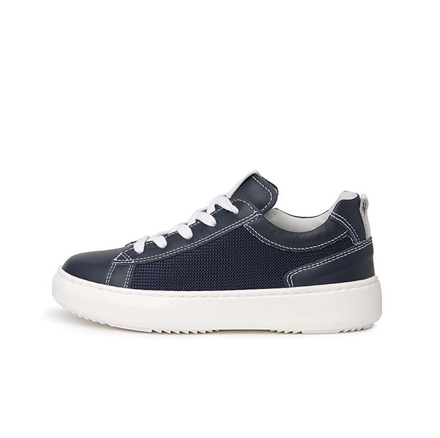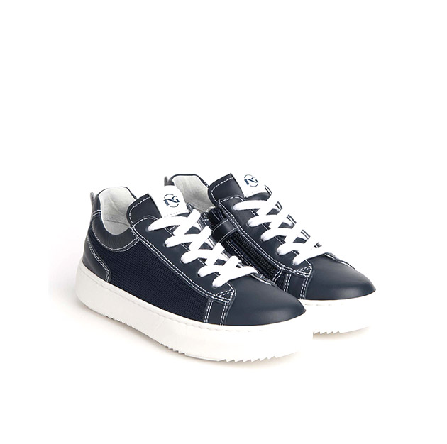 Sneaker Bambino blu in pelle e tela, con fondo a contrasto di colore. Stile sporty-glam. Made in Italy.