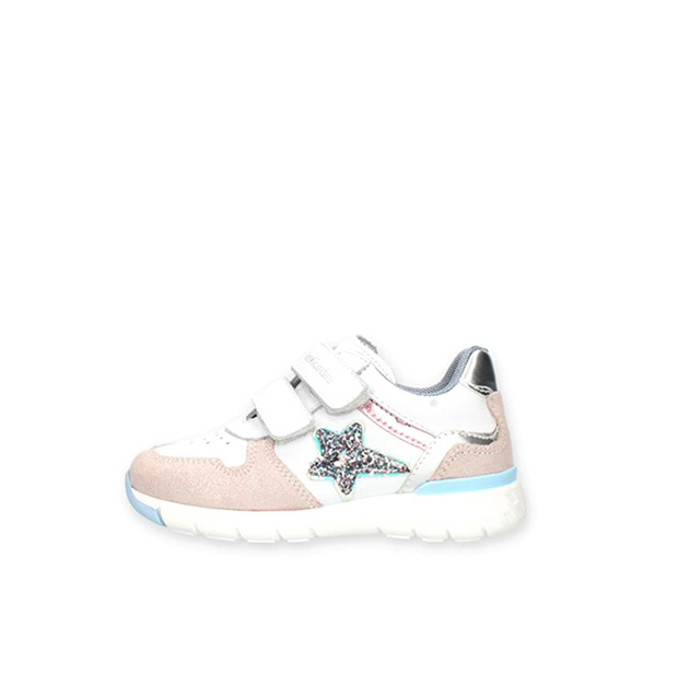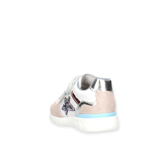 Sneaker Bimba in pelle e camoscio, con forature, applicazione glitterata a forma di stella ed inserti laminati a contrasto di colore. Stile sporty-glam. Made in Italy.