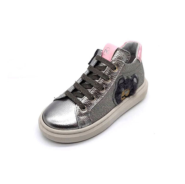 Sneaker Bimba acciaio in pelle, con inserti glitterย ed inserto orso peloso applicato sul lato. Stile sporty-glam per questa scarpa adatta ad ogni outfit. Made in Italy.