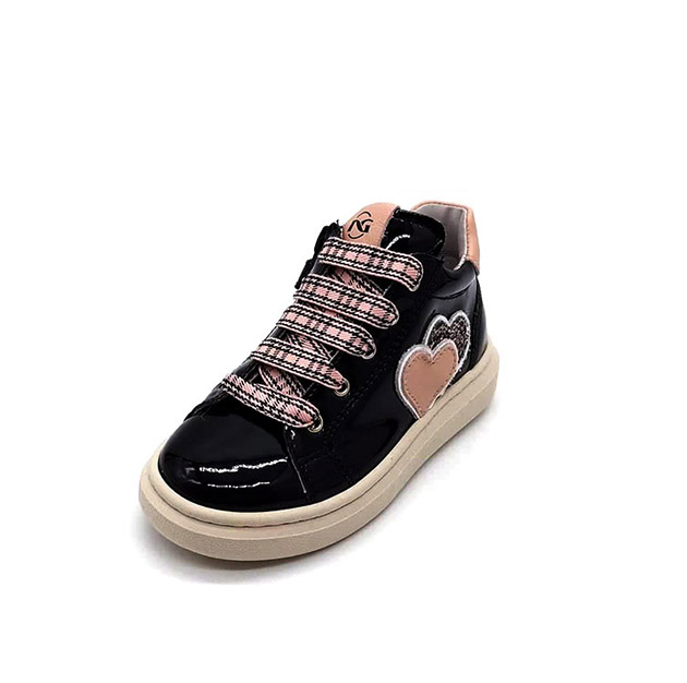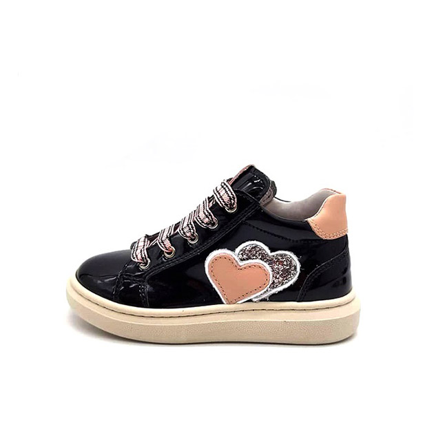 Sneaker Bimba nera in pelle verniciata, con lacci moda a contrasto di colore, e cuori applicati sul lato. Stile sporty-glam per questa scarpa adatta ad ogni outfit. Made in Italy.