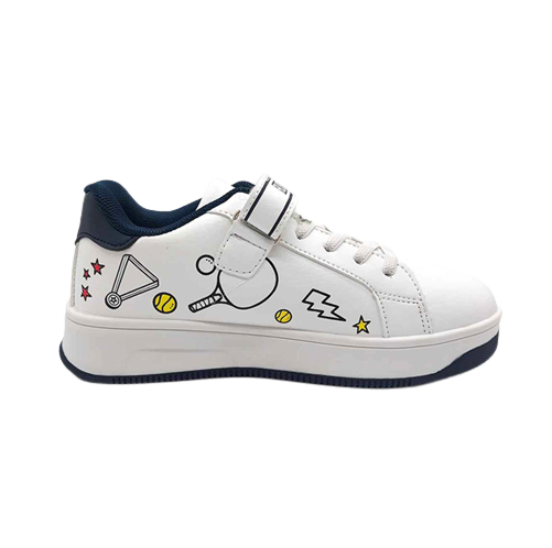 Sneaker Bimbo bianca e blu in ecopelle, con fondo a contrasto di colore e divertenti disegni laterali. Stile sporty-glam.