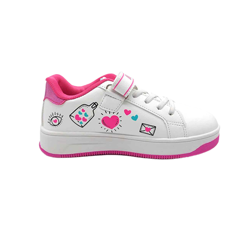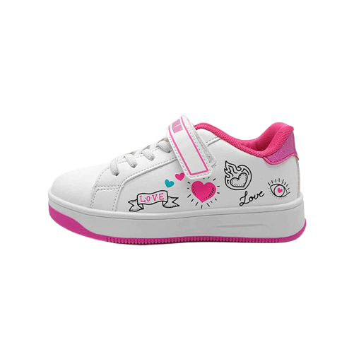 Sneaker Bimba bianca e rosa in ecopelle, con fondo a contrasto di colore e divertenti disegni laterali. Stile sporty-glam.