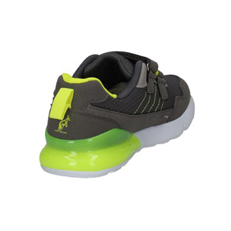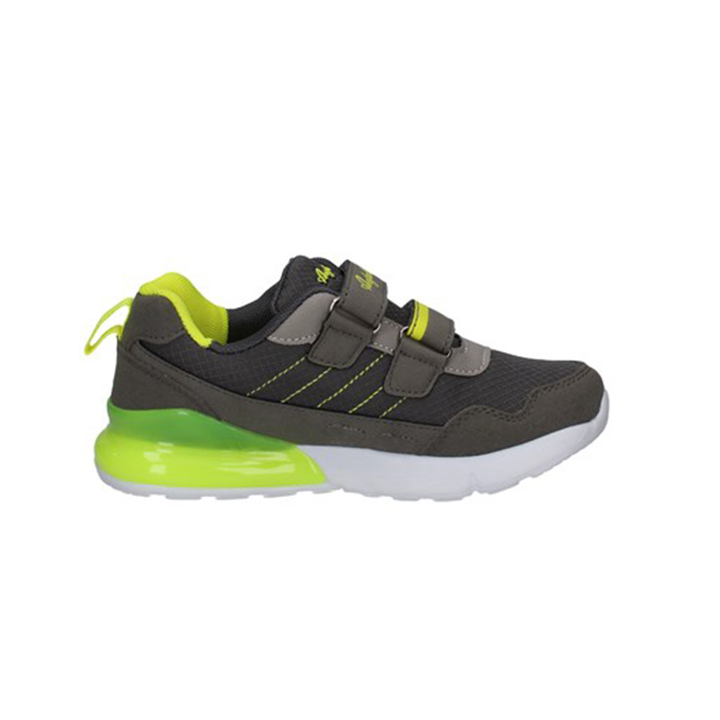 Sneaker Bimbo grigia in tessuto ed ecopelle, con dettagli giallo fluo a contrasto. Stile urban per questa scarpa adatta ad ogni outfit.