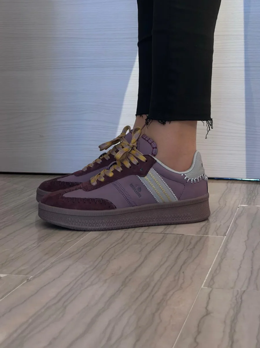 Questa sneaker dal design vintage mixa camoscio borgogna e dettagli tortora, completati da lacci color senape e suola in gomma naturale.