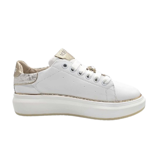 Sneaker Donna bianca/platino in pelle ed ecopelle, con logo e dettagli a contrasto metal gold. Impreziosita da particolare charm sui lacci. Stile sporty-glam.
