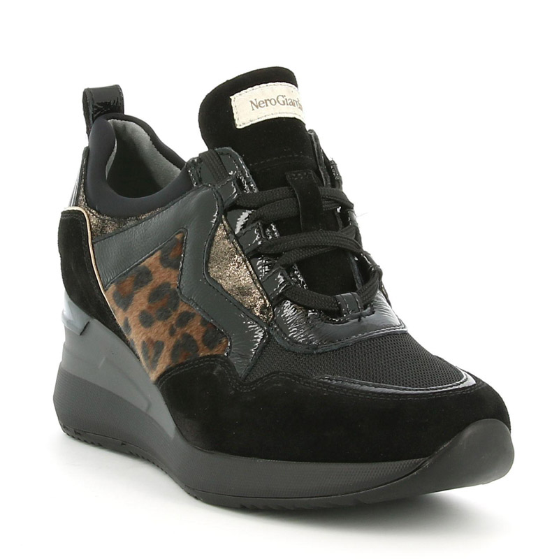 Sneaker Donna nera in camoscio, con inserti in pelle e tessuto tecnico con stampa animalier. Scarpa in stile sporty-chic, ideale per essere indossata tutto il giorno. Made in Italy.