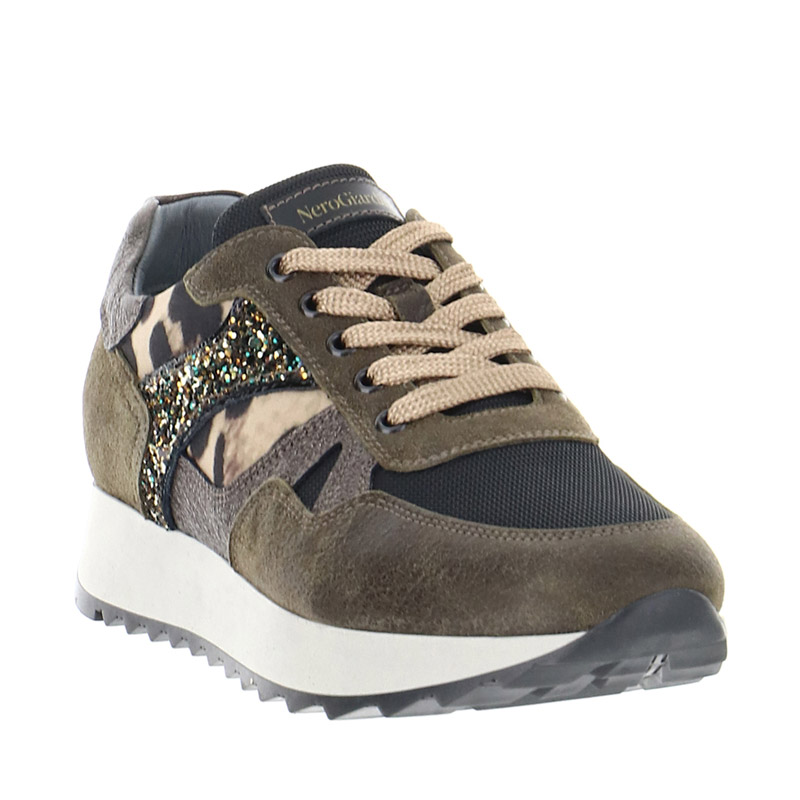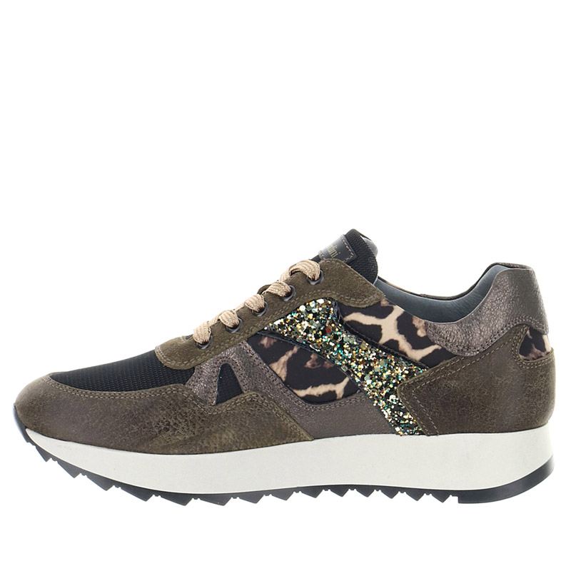 Sneaker Donna militare in camoscio con inserti in tela, tessuto glitterato e stampa animalier in cavallino. Il sottopiede con tecnologia DryGo assorbe l’umiditร e garantisce comfort e benessere. Design grintoso per un look urbano e di tendenza. Made in Italy.