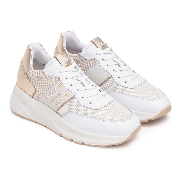 Sneaker Donna bianca in pelle e tessuto, con inserti in camoscio. Impreziosita dettaglio oro sul tallone e mini borchie dorate su fasce laterali. Ideale per ogni outfit, elegante e sportiva. Made in Italy.