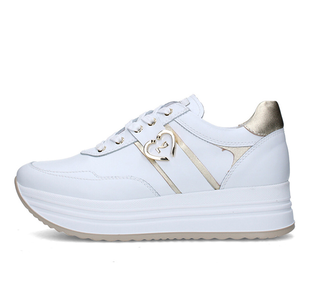 Sneaker Donna bianca in pelle con logo laterale e dettaglio cuore in metal gold. Inserti laminati a contrasto di colore. Questa sneaker รจ un must-have per ogni stagione. Stile casual-chic. Made in Italy.