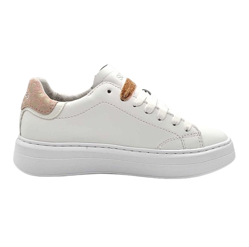 Sneaker bianca in pelle, con inserto nero e rosa a contrasto sulla parte posteriore. Logo laterale tono su tono. Lacci rosa lurex in dotazione. Stile urban e sportivo per questa scarpa adatta a tutti gli outfit.