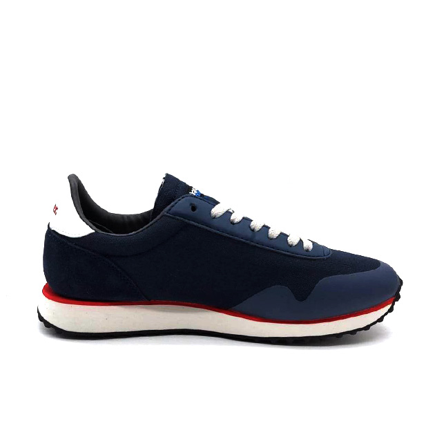 Sneaker Uomo blu in pelle, tessuto ed inserti in camoscio. Logo laterale e sul retro a contrasto di colore. Stile sporty-glam adatto a tutti gli outfit.