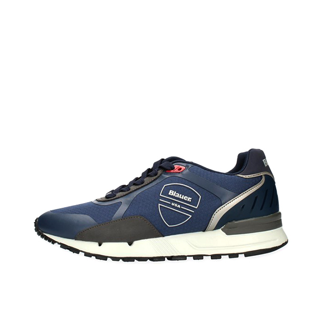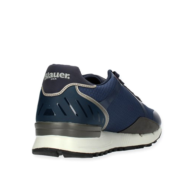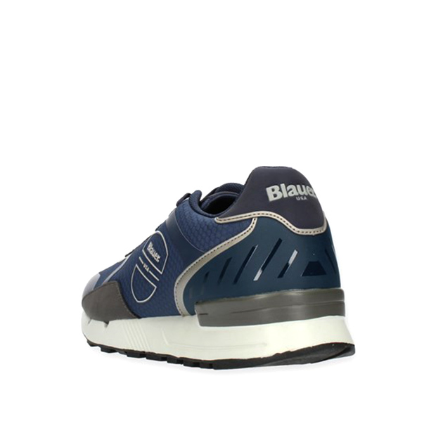Sneaker Uomo blu in tessuto nylon, con inserti in pelle e dettagli lucidi. Logo Blauer Usa in rilievo sulla fascia laterale. Look casual e mood sporty.
