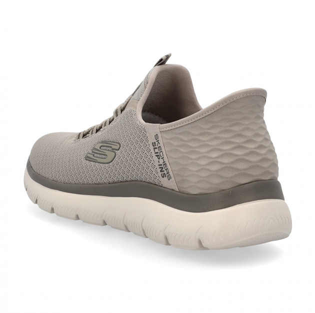 Sneaker Uomo taupe in mesh, con logo laterale. Oltre al nostro esclusivo Heel Pillowโข, che mantiene il piede saldamente in posizione, questo modello vegano presenta uno speciale pannello sagomato Skechers Slip-insโข sul tallone, che premette di levare le scarpe senza mani, con lacci fissi e una soletta ammortizzata Skechers Air Cooled Memory Foamยฎ.