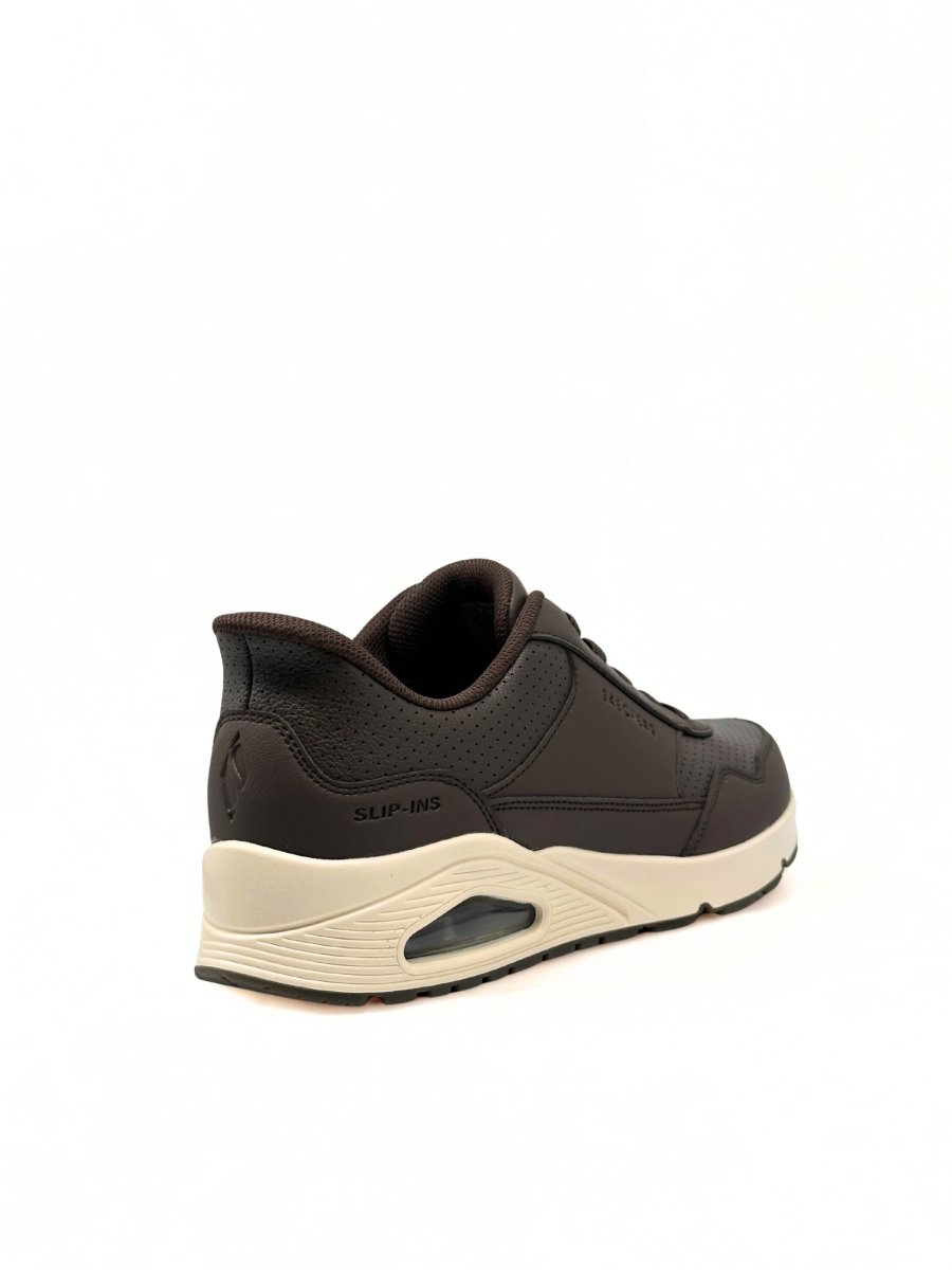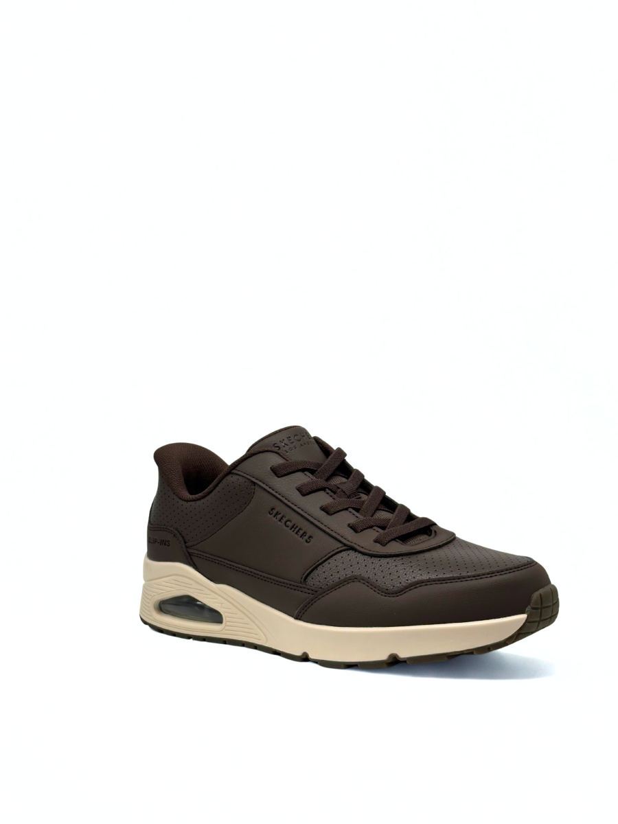 Sneaker UOMO SKECHERS UNO BANKSIA LUXE CHOCOLATE 183023/CHOC unisce eleganza urbana e comfort avanzato con tomaia in similpelle liscia, soletta Air-Cooled Memory Foamยฎ e intersuola Skech-Airยฎ ammortizzata.