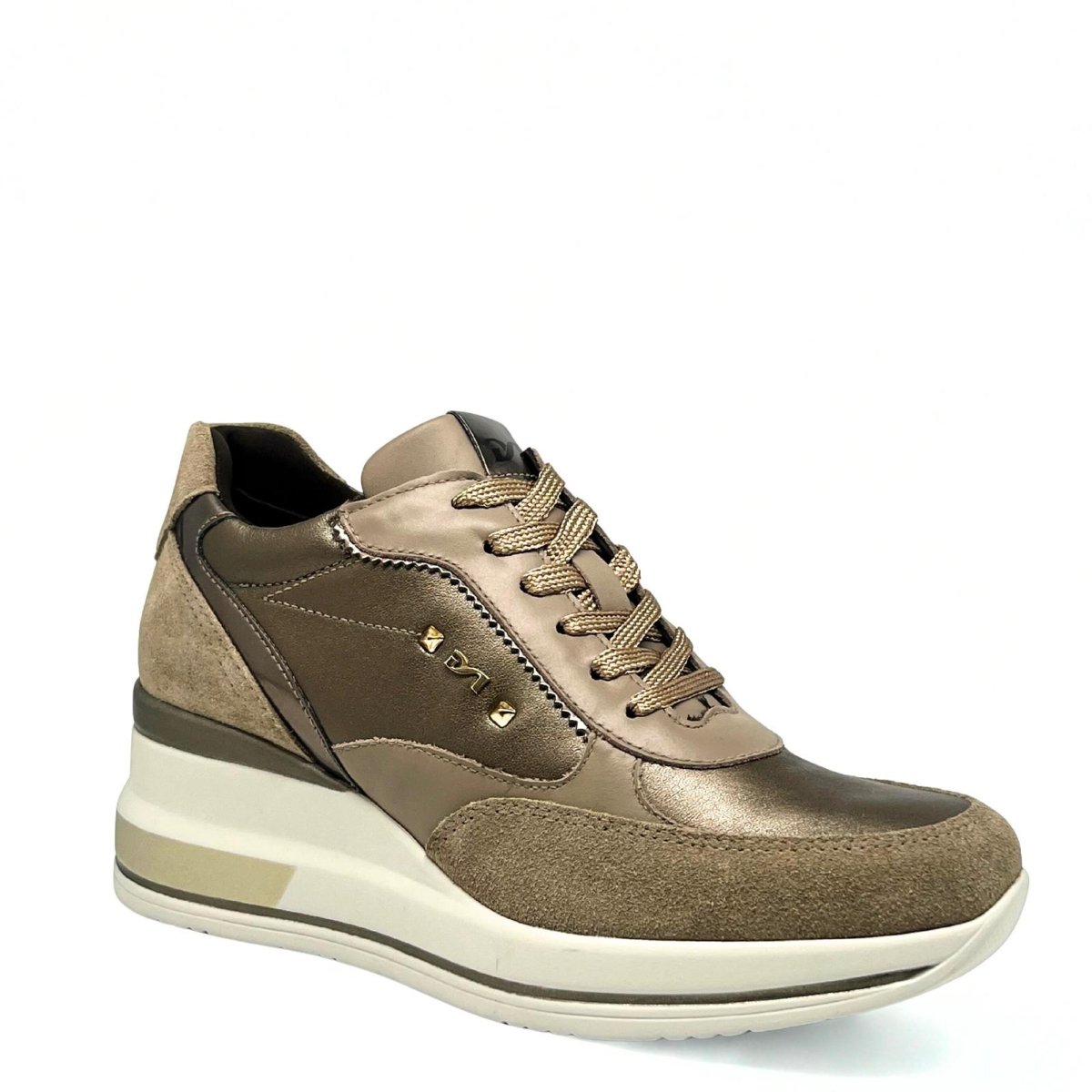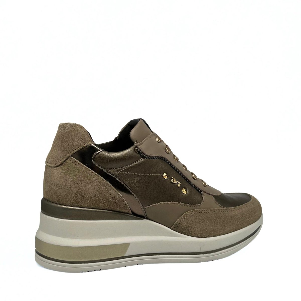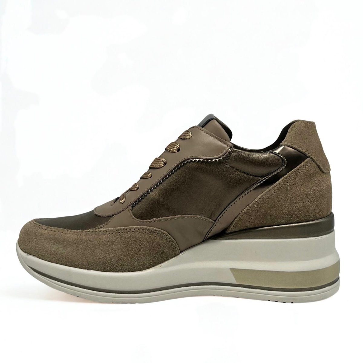 Sneakers Nero Giardini da donna in pelle color argilla, con dettagli ricercati e suola platform. Un mix perfetto di eleganza e comfort per uno stile contemporaneo e sofisticato.
