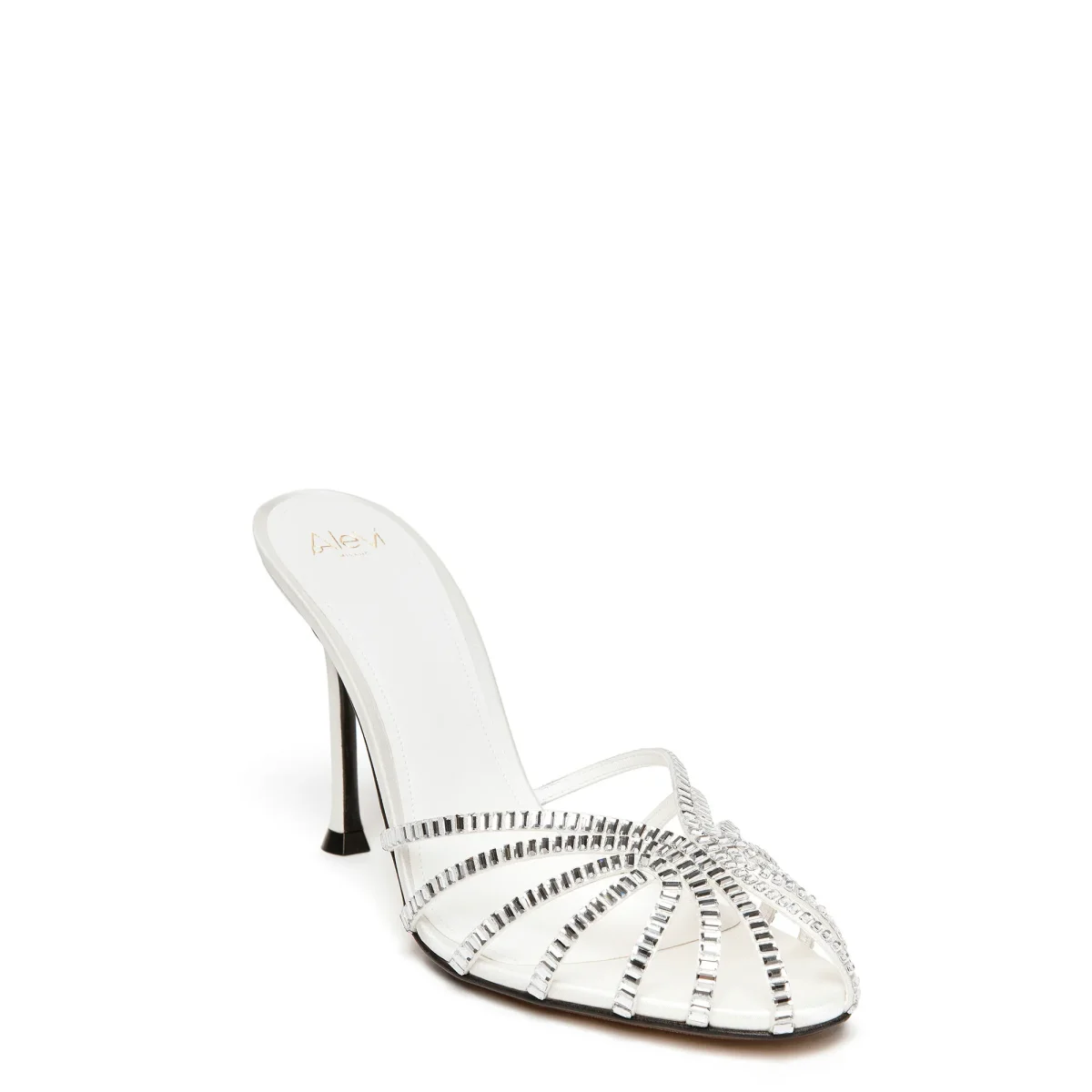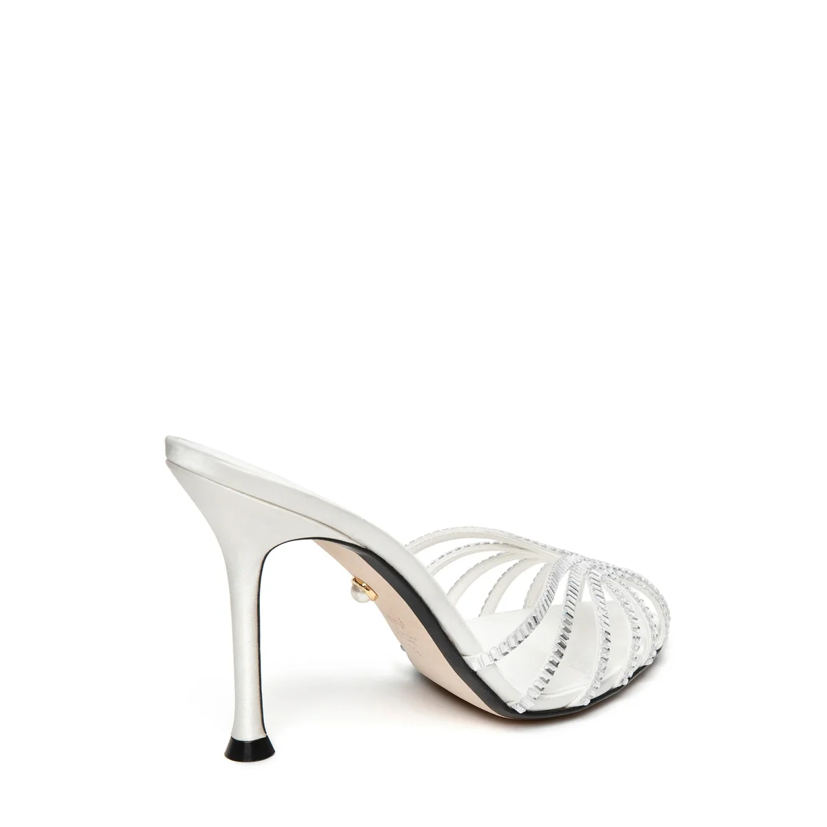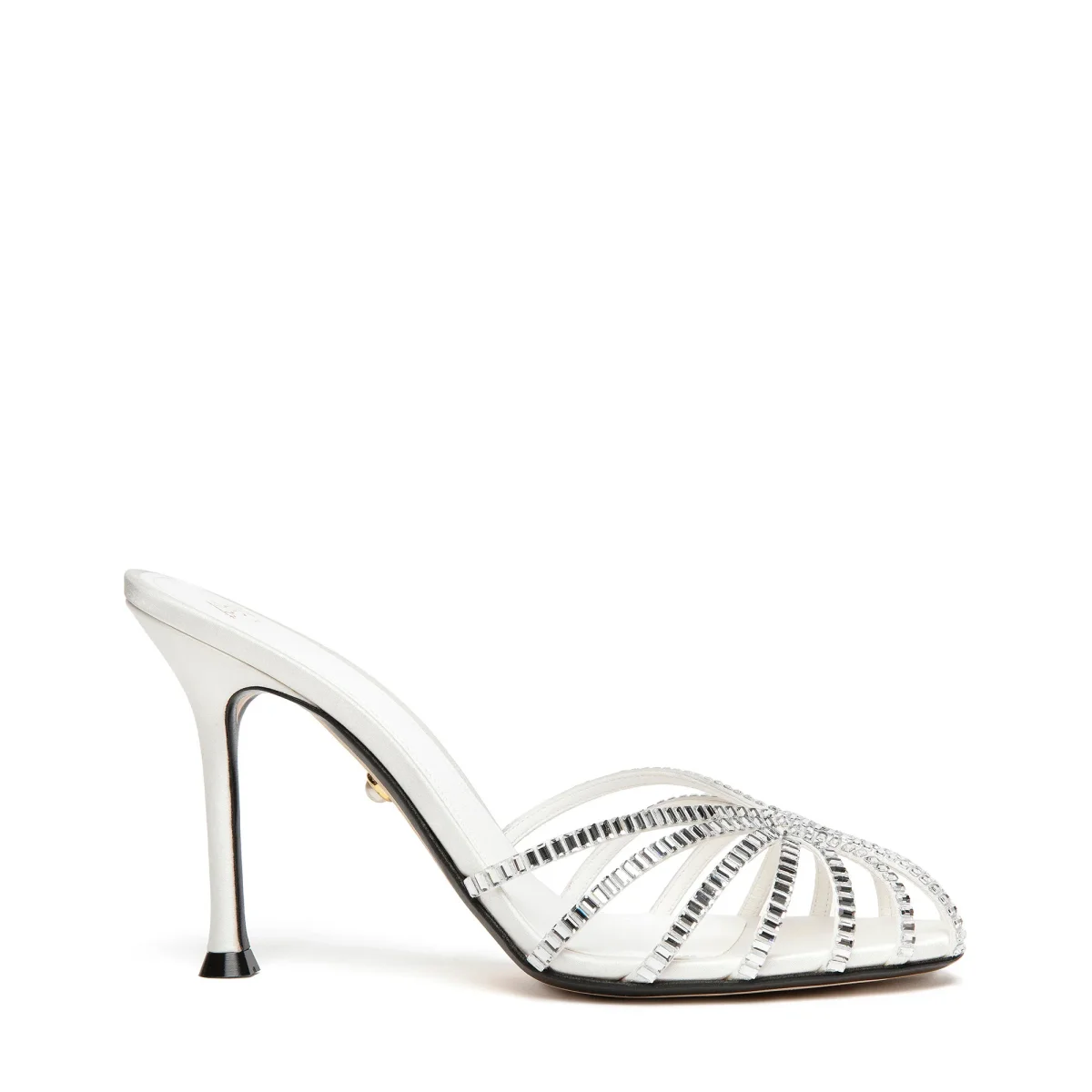 Sabot gabbia in raso ricoperta di cristalli baguette. Tacco laccato in tono.