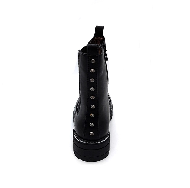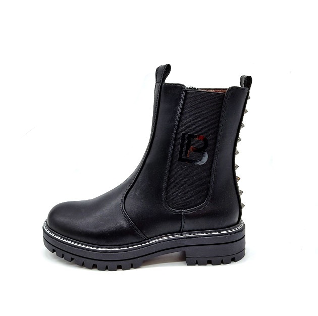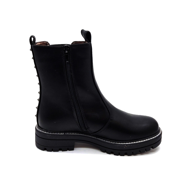 Stivale Bambina nero in ecopelle, con chiusura laterale con zip e molla loggata. Dettaglio borchie sul retro.