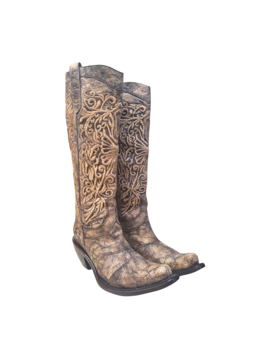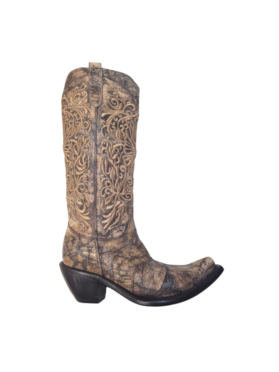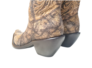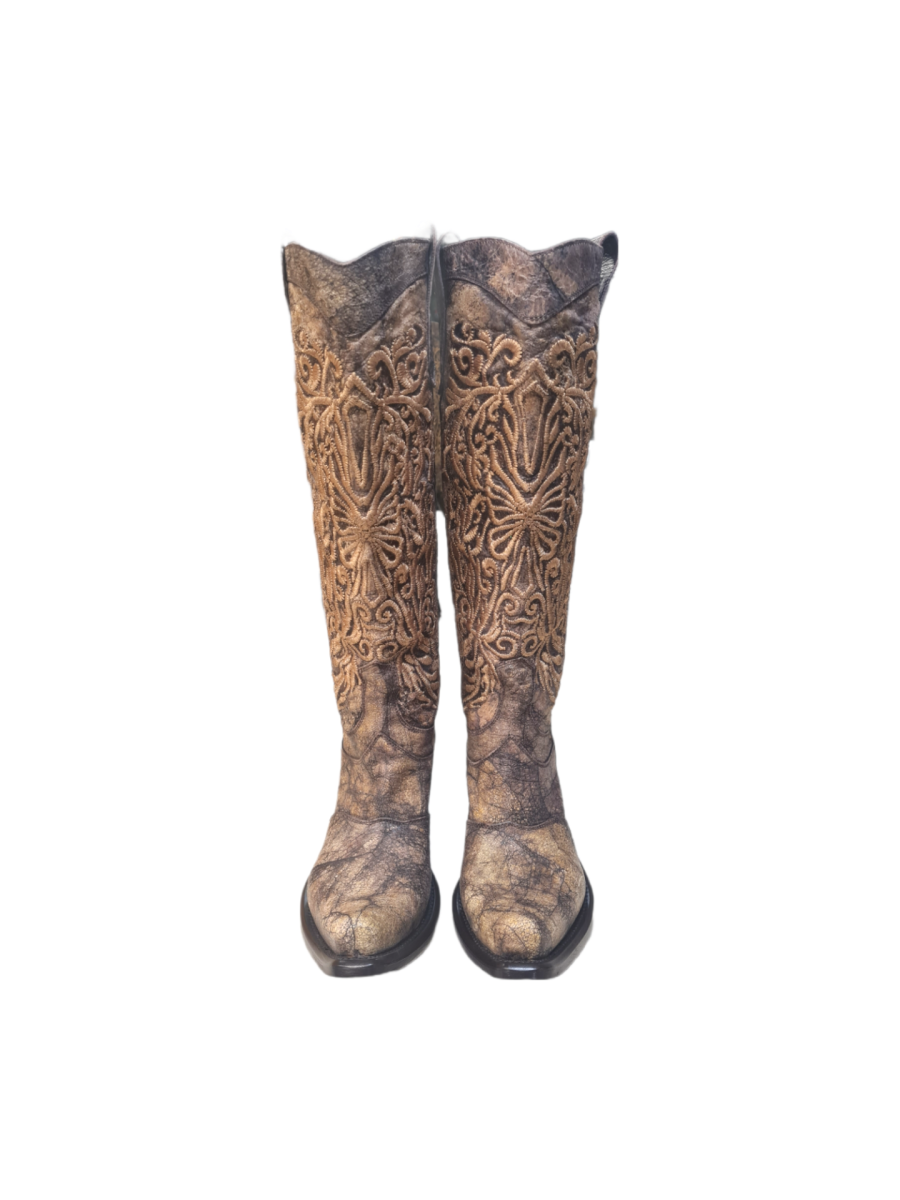 Stivale donna modello camperos Gianni Barbato.Le sue scarpe sono delle vere e proprie opere d’arte. In vera pelle sui toni del marrone, al ginocchio, con ricami realizzati con filo dorato. Tacco 50 mm.