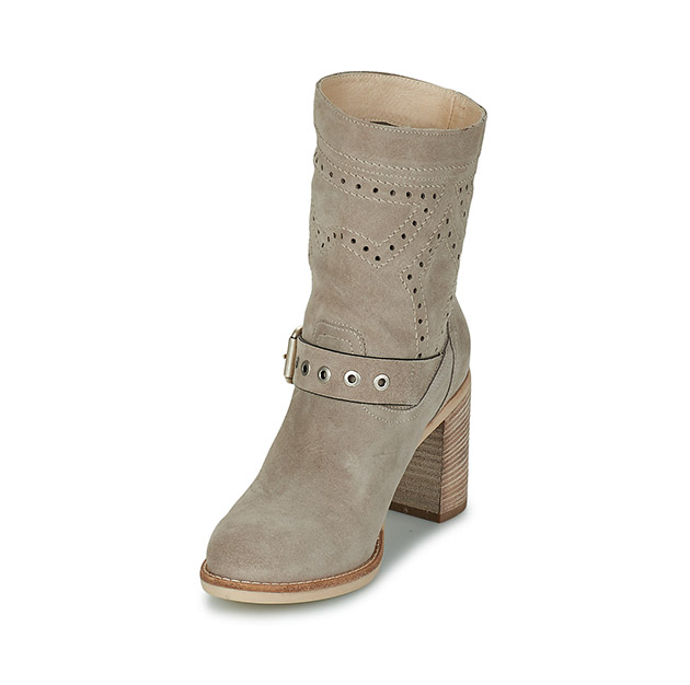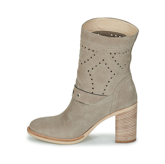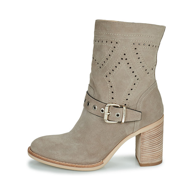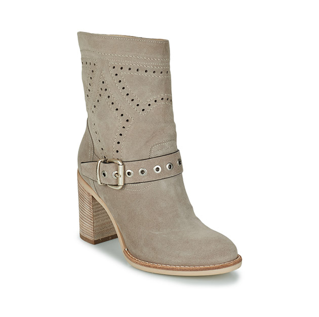 Stivaletto Donna creta in camoscio stile texano, con inserti traforati e cinturino lissato, impreziosito da occhielli e fibbia metal effetto old. Look grintoso e di tendenza. Made in Italy.