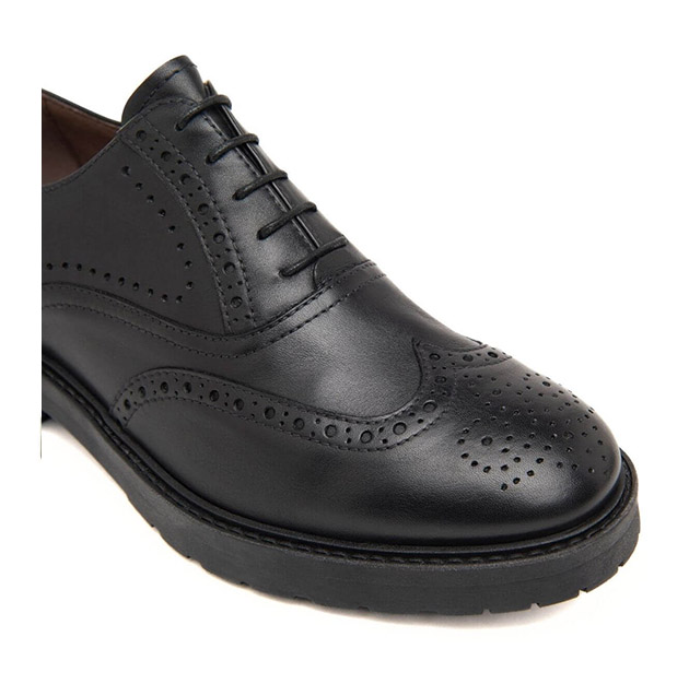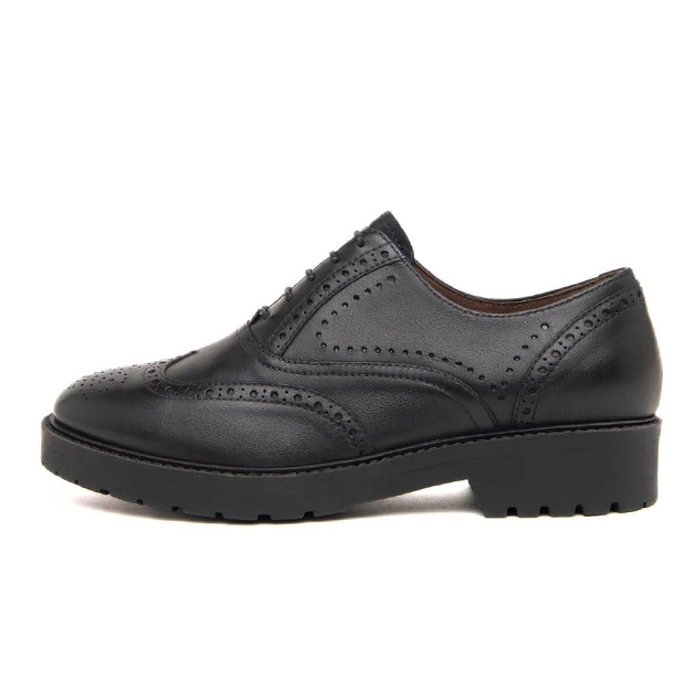 Stringata Donna in pelle nero con fantasia a coda di rondine ed impuntura all’inglese. Elegante. Made in Italy.
