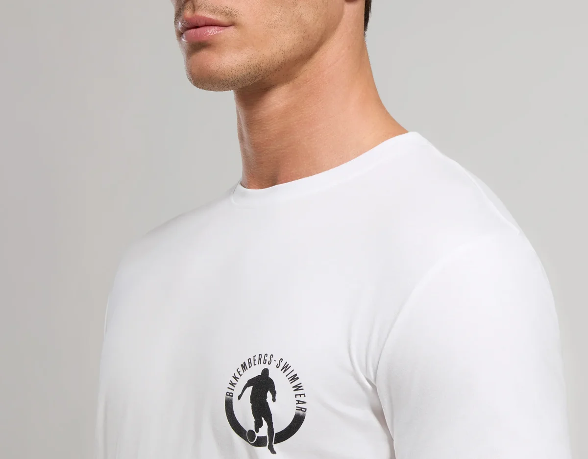 DETTAGLI Realizzata in cotone stretch, questa T-shirt mare da uomo in tinta unita รจ decorata dall’immagine dell’iconico giocatore di calcio Bikkembergs. La maglietta presenta maniche lungo e fondo dritto. COMPOSIZIONE E LAVAGGIO 95% CO 5% EA LAVARE A MANO; NOME PRODOTTO MTS02