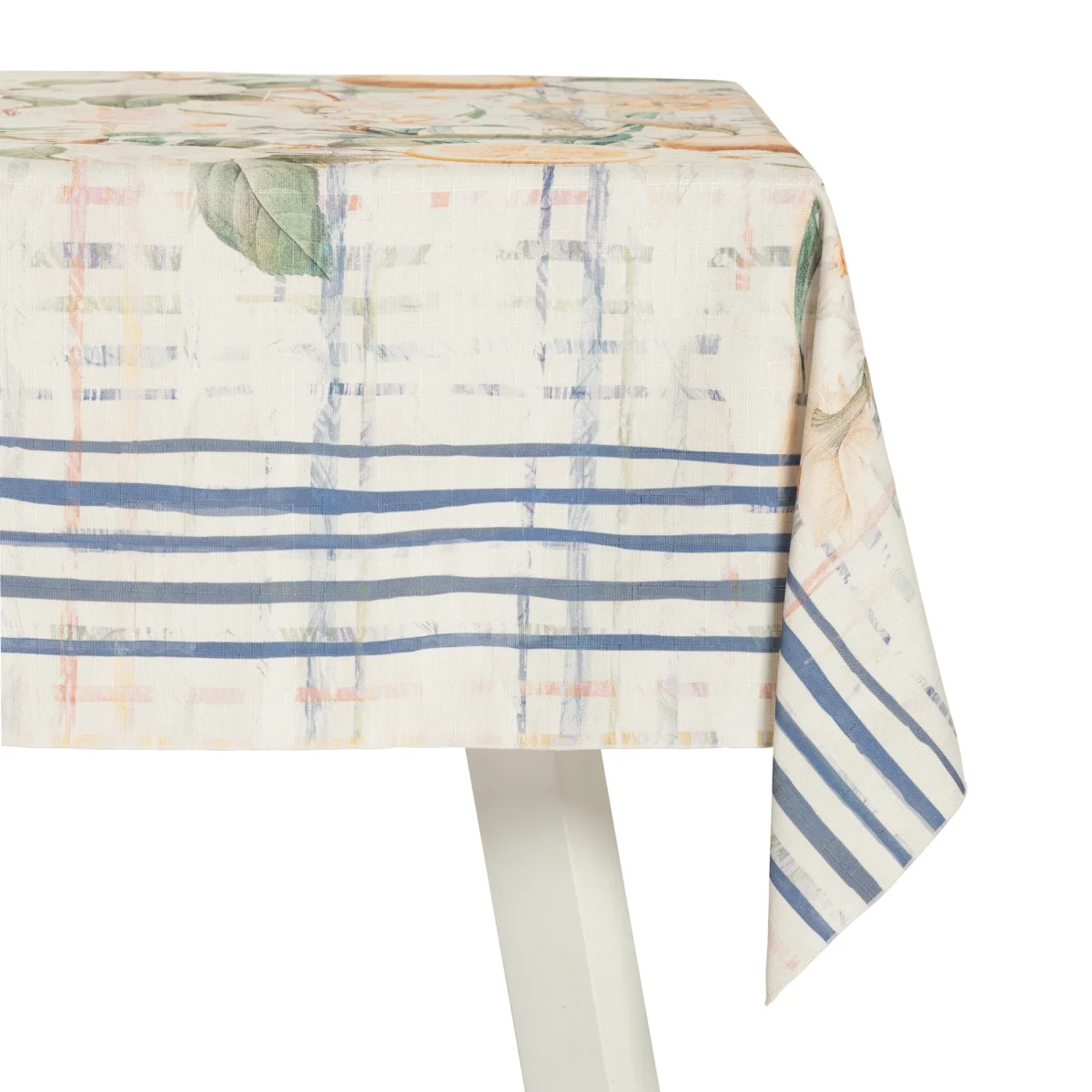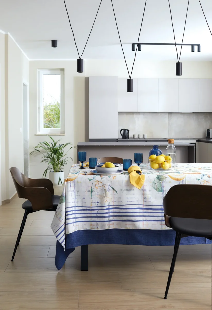 Questa tovaglia non รจ solo un elemento funzionale, ma una vera opera d’arte per la tavola. I limoni e fiori acquerellati nei toni pastello, incorniciati dalle righe blu navy, creano una composizione equilibrata e raffinata che valorizza ogni mise en place primaverile, trasformando ogni pasto in un momento di freschezza che celebra la bellezza delicata della natura mediterranea con stile coastal-chic.