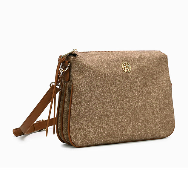Tracolla Donna nut in tessuto con inserti in pelle e logo. Pratica, funzionale e piรน che mai di tendenza. Tracollina pochettone 3 comparti interni Chiusura principale con patta con zip Interno foderato