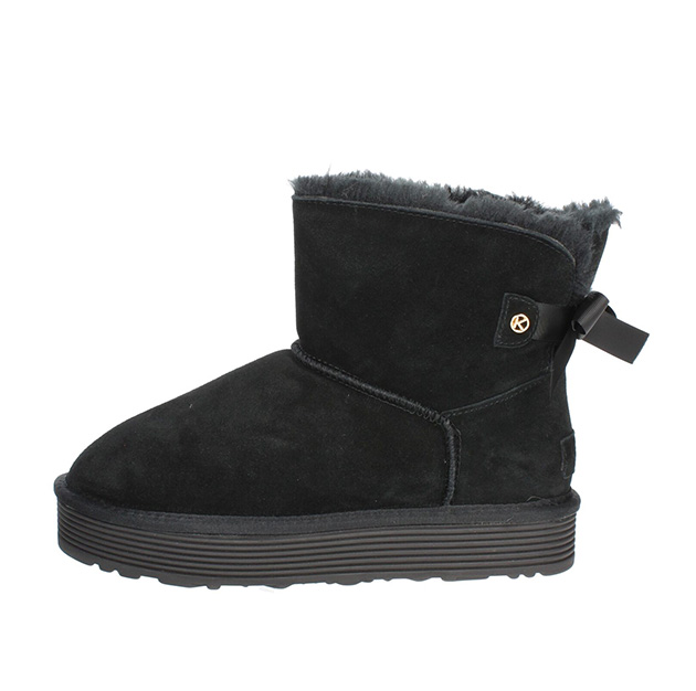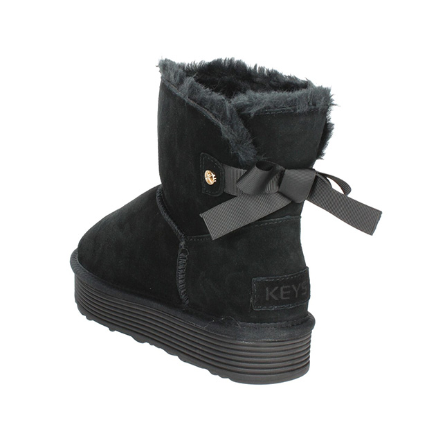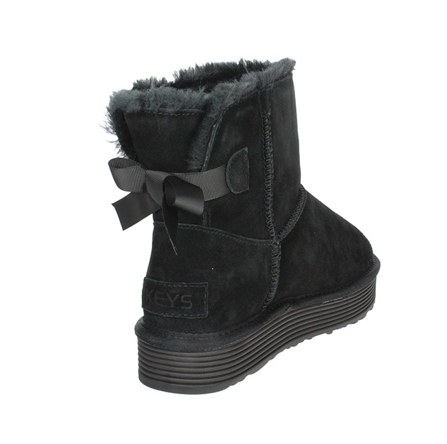 Tronchetto Donna nero in camoscio, rivestito internamente di calda pelliccia sintetica. Cuciture in rilievo tono su tono, fiocchetto e logo posteriore e logo laterale. Qualitร e comoditร garantita dal Brand Italiano Keys.