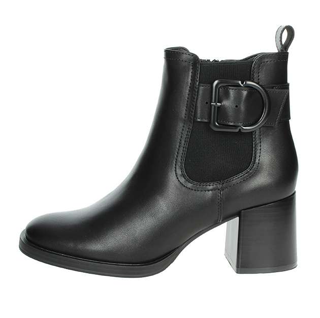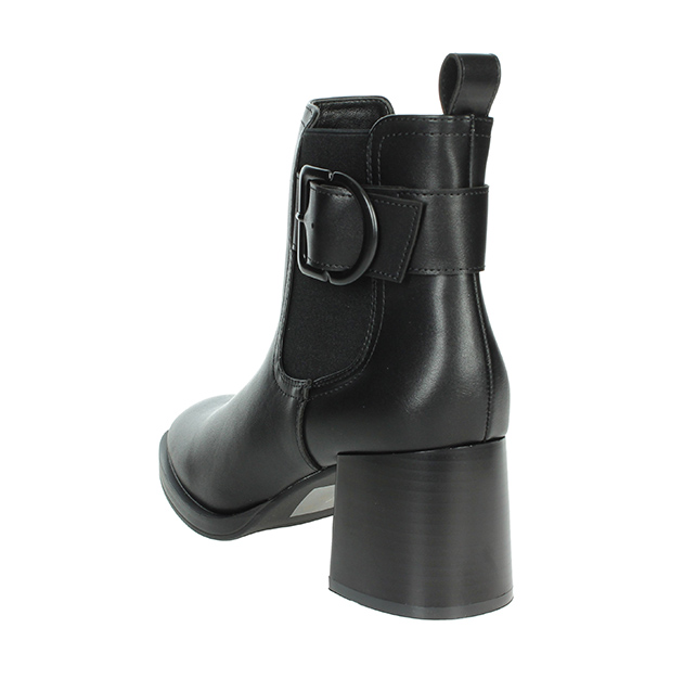 Tronchetto Donna nero in pelle ed ecopelle, impreziosito da fibbia ornamentale sul lato a contrasto di colore. Stile glam-chic per questa scarpa adatta ad ogni outfit.
