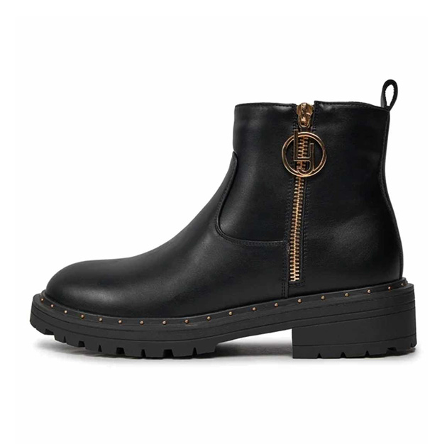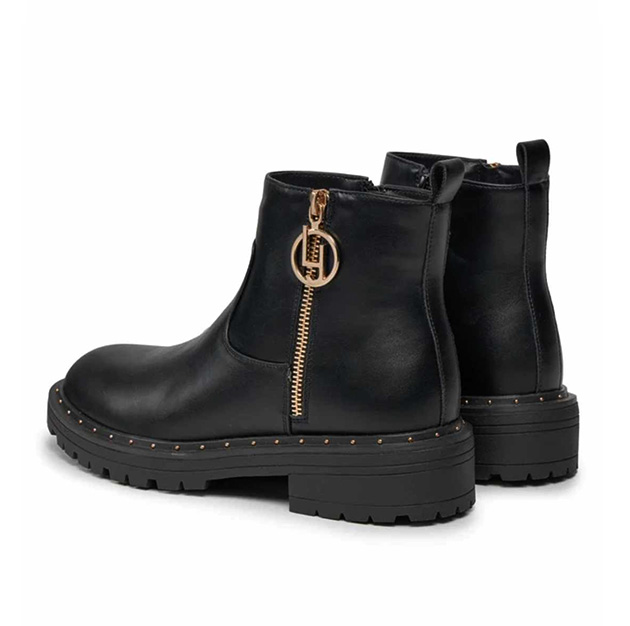 Tronchettoย Donna nero in pelle, con mini borchie sul fondo e finta zip laterale metal gold con logo.ย Stile sporty-glam.