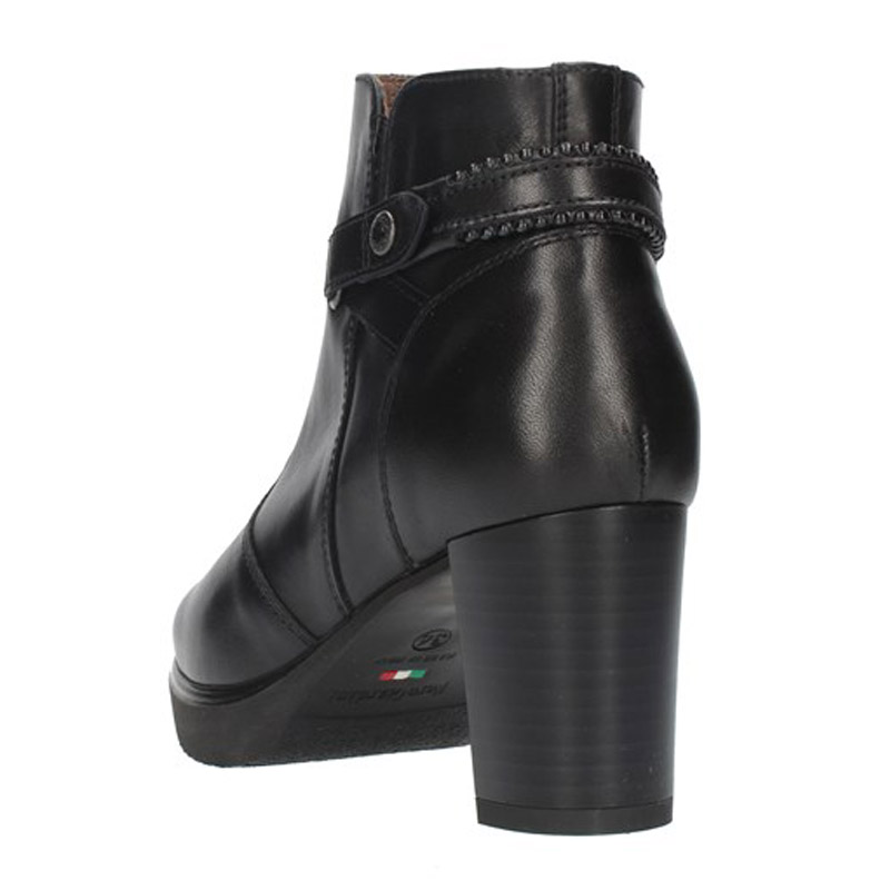 Tronchetto Donna nero in pelle, con cinturino laterale incrociato con borchie applicate. Look glamour ed elegante per questa scarpa adatta ad ogni outfit. Made in Italy.