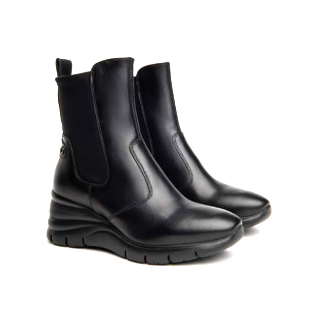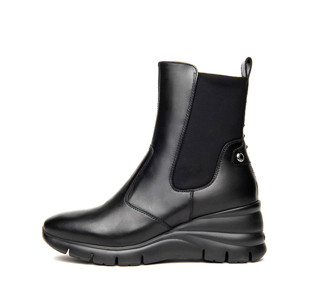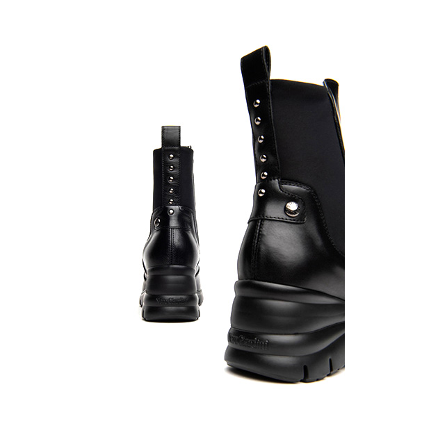 Tronchetto Donna nero in pelle, con inserto in tessuto tecnico elastico e borchiette. Design minimal per un look glamour. Made in Italy.