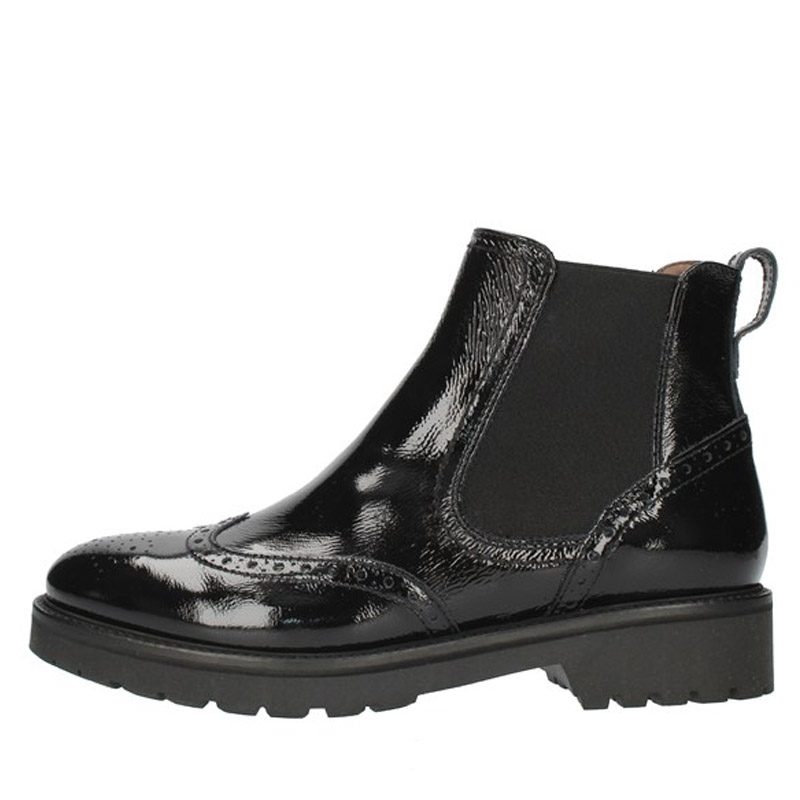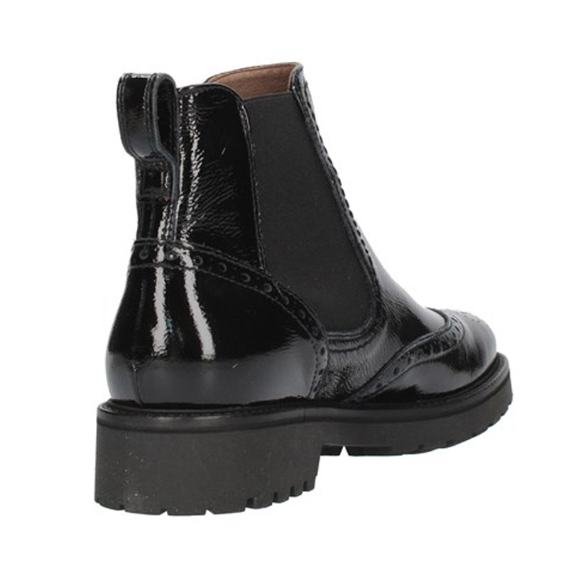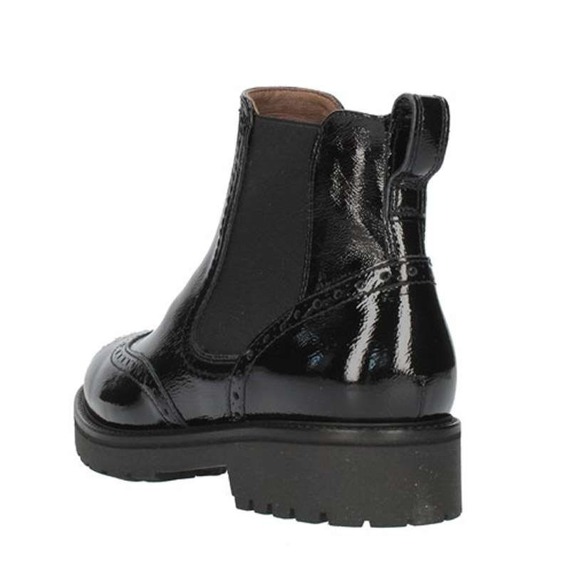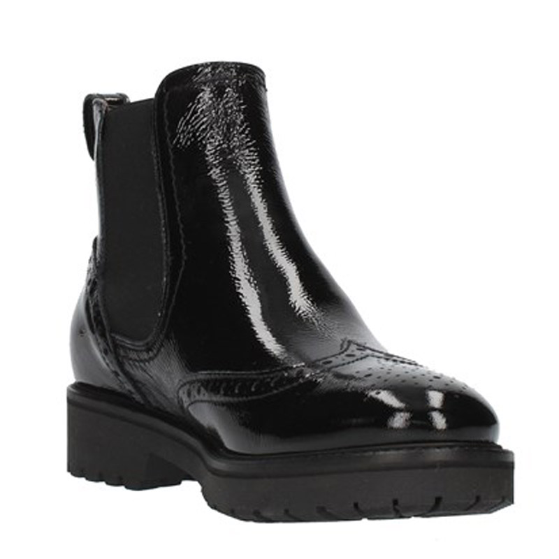 Tronchetto Chelsea Donna nero in pelle in vernice, con impunture a coda di rondine ed elastici laterali. Look glamour ed elegante per questo must Nero Giardini. Made in Italy.